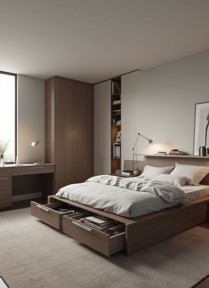 Storage is essential, but in a small space, the type of storage matters. Open and floating units allow air and light to flow freely, giving a cleaner, more open appearance to your room.